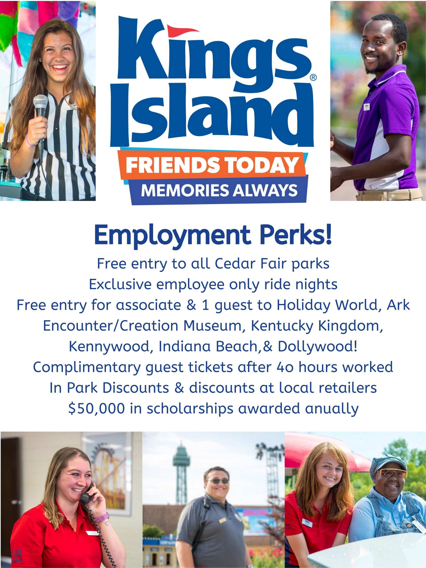 Associate benefits include flexible schedules for students teachers parents retirees and part-time job seekers option to work as many or as few hours as you want free seasonal admission to Kings Island and all Cedar Fair amusement and water parks discounts on food and merchandise associate-only ride nights parties picnics field trips. How Youll Make A Difference. Ad Join For Free Get Matched to the Jobs You Want.